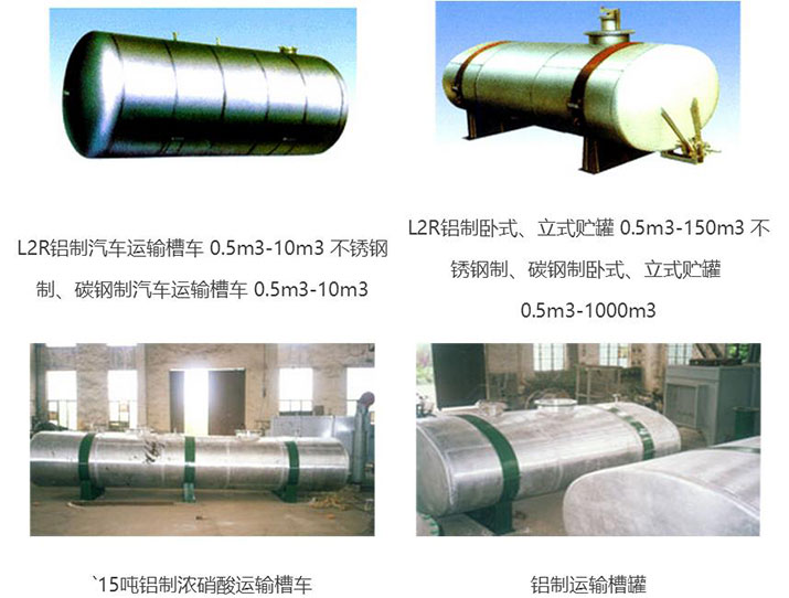 工業純鋁板制汽車運輸槽車、臥式、立式貯罐、高位槽。(主要用于貯運 濃硝酸、冰醋酸等腐蝕液體)不銹鋼、碳鋼制各種汽車運輸槽車,臥式、 立式貯槽,高位槽計量槽。特殊規格可按用戶需求設計、制造。